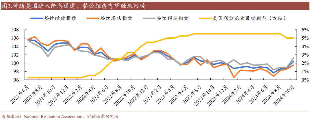 餐饮经济处于扩张期,伴随美国进入降息通道,餐饮经济有望触底回暖。根据National Restaurant Association的统计数据RPI,通常餐饮经济处于扩张期,这主要是因为餐饮具有消费属性和必需品属性,随着经济的发展与生活水平的提高将平稳发展;2020年3月受疫情影响美国餐饮经济开始进入收缩期;2021年2月餐饮经济重新进入扩张期,并且此后表现优于疫情前。2024年10月餐饮预期指数101.2,环比+2.2,领先现状指数重回扩张区间,意味着餐厅运营商对后续餐饮业状况预期持乐观态度,同时伴随美国进入降息通道,餐饮经济有望触底回暖。