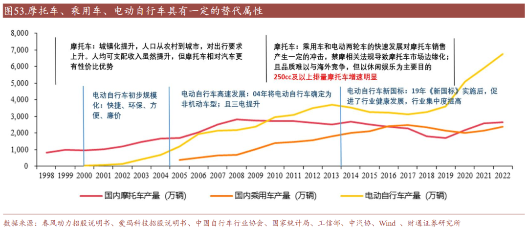 - 从时间上来看,从2000年左右,各大国内摩托车厂开始布局250cc以上的车型,并且排量逐步增大,产品覆盖度上升,开始竞争高端市场。