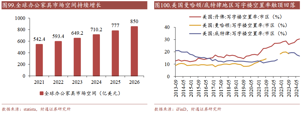 可升降办公桌收入增速远超普通办公桌,智慧办公潜在空间巨大。根据Statista数据显示,2021年全球办公家具市场空间为542.3亿美元,预计2026年将成长至850亿美元。