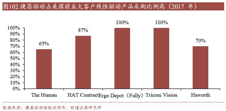 深耕海外,客户深度绑定合作稳固。捷昌驱动美国前五大客户均为美国客户,其线性驱动产品采购额份额超过60%,深度绑定。此外捷昌驱动进入HermanMiller、HNICORP等年销售额超20+亿美元的传统办公家具巨头的供应体系,销售额提升空间巨大。