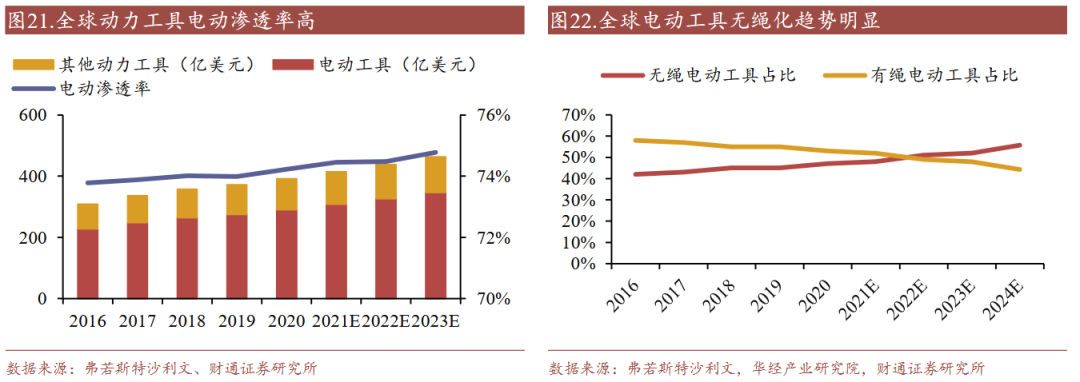 动力工具市场电动渗透率高。根据弗若斯特沙利文数据,2020 年全球动力工具市场规模392亿美元,其中电动工具市场规模291亿美元,电动渗透率达74.23%,预计到2023年动力工具电动渗透率将达74.78%。