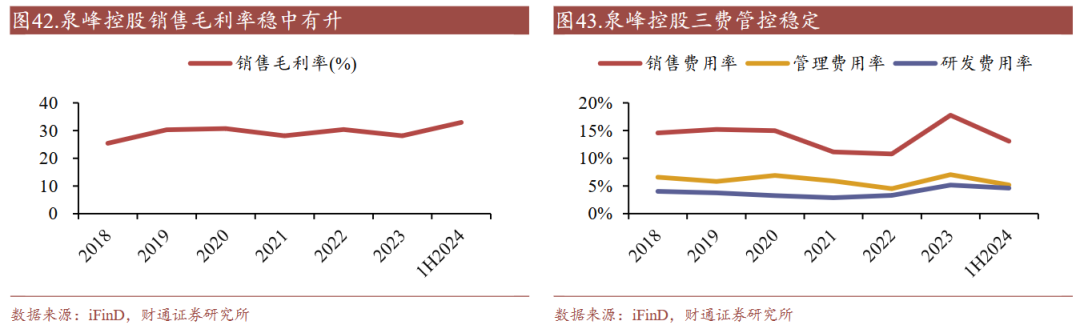 销售毛利率稳定,三费管控稳定。2018-2023年,泉峰控股销售毛利率维持在25%-30%左右,2024H1毛利率达32.9%,稳中有升。费用管控方面,2018-2024H1,泉峰控股销售费用率维持在15%左右,1H2024达13.08%,管理费用率维持在6%左右,研发费用率维持在4%左右,三费管控稳定。