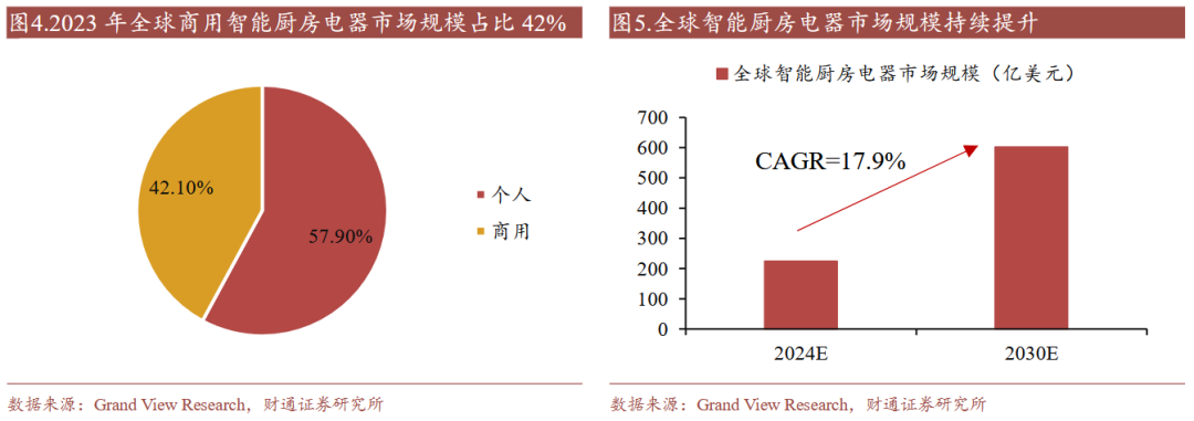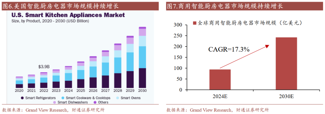 全球智能厨房电器市场迎来显著的增长机遇。根据Grand View Research,2023年该市场全球规模达到了187.5亿美元,预测在2024年至2030年间,市场将以17.9%的CAGR持续扩容。其中商用智能厨房电器占比较小,2023年市场规模约为78.9亿美元,占比达42.1%,2024-2030的CAGR预计为17.3%。消费增长进一步推动餐饮业对先进厨房电器的投资意愿持续增强。智能厨房电器通过提升食品质量控制、减少对于人工的需求以及降低操作失误次数,可有效提高厨房工作效率。因此烤炉、油炸锅、烤箱和电磁炉等智能电器的使用率持续提高,全球餐饮业在厨房产品和电器上的投资将持续增长,同时将为智能厨房电器市场带来更加广阔的发展前景。