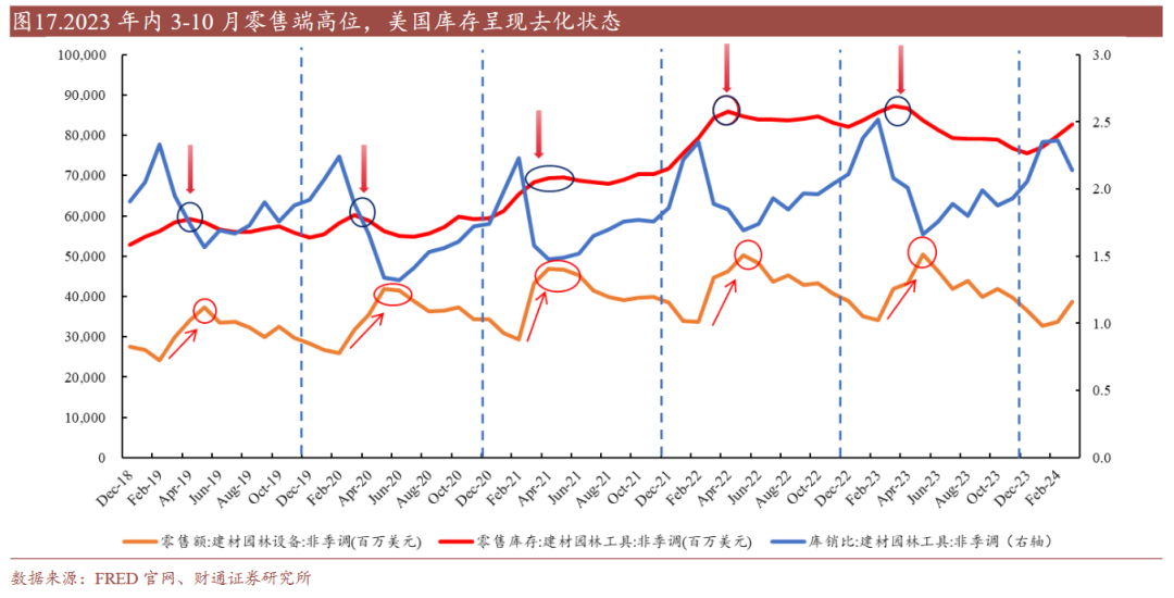 库存端看,通常年初1-2月零售端较弱,同时为迎接即将到来的零售高峰季节,零售端逐渐累库;从3月份起,零售端大幅向上至4/5月达到零售高峰,库存呈现去化状态;随后直到10月左右零售端均保持相对高位。为了应对四季度万圣节、黑五、感恩节、圣诞节等购物节日销售小高峰,通常在三季度至四季度会有一定补库动作。