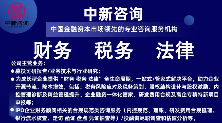中新咨询:服务“中”国“新”经济的专业投资咨询机构,是国内领先的IPO/再融资咨询机构,“财税法”【全生命周期/全案全流程】咨询行业的开创者和领导者。公司主营业务包括: