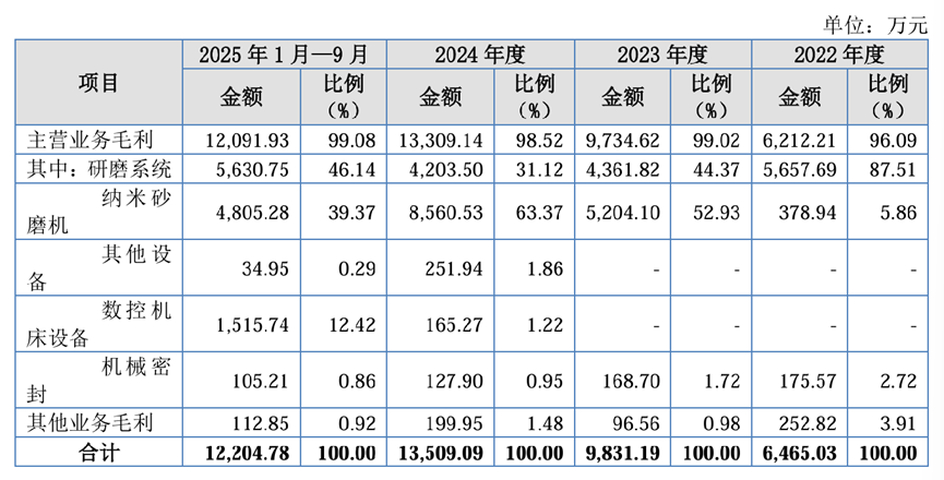 报告期内,公司综合毛利分别为6,465.03万元、9,831.19万元、13,509.09万元和12,204.78万元,其中主营业务毛利占毛利总额的比重较高,分别为96.09%、99.02%、98.52%和99.08%,公司主营业务突出,获利能力稳定。2022年、2023年、2024年和2025年1-9月,研磨系统、纳米砂磨机单机设备毛利占比分别为93.37%、97.30%、94.48%和85.51%,研磨系统和纳米砂磨机单机设备是公司毛利的主要来源。