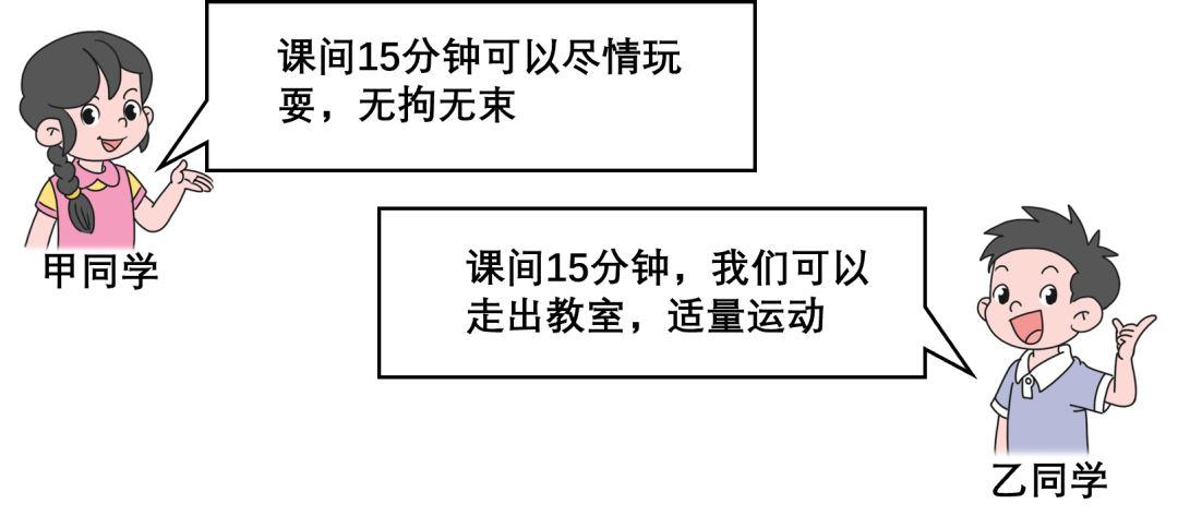 从2025年春季学期起,我省各地义务教育学校将对课间安排做出整体统筹优化,落实15分钟课间时长。同学们围绕这一话题展开交流,以下是甲、乙两名同学的观点。