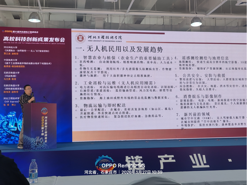 河北科技大学贾江波博士发布《多源融合・协同智控——无人飞行智能控制》;中国地质大学杨浩教授团队成员俞添泷博士发布《基于工业固体废弃物的地聚合物井下堵漏技术》;石家庄铁道大学马文勇教授发布《风起电涌》,杨海涛副教授发布《高性能低碳混凝土》;河北工程技术学院张琛博士发布《ICT Express》。四位教授分别介绍了团队的最新科研成果,展现了高校在智能制造、新材料、绿色低碳等领域的创新实力。