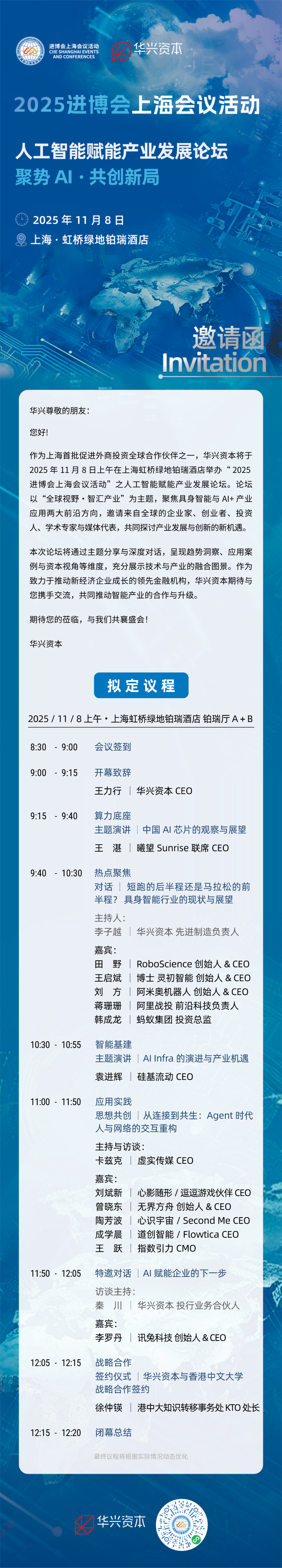 作为上海首批促进外商投资全球合作伙伴之一,华兴资本将于 2025 年 11 月 8 日上午在上海虹桥绿地铂瑞酒店举办 2025 进博会上海会议活动之人工智能赋能产业发展论坛。论坛以“全球视野 · 智汇产业”为主题,聚焦具身智能与AI+产业应用两大前沿方向,邀请企业家、创业者、投资人、学术专家与媒体代表,共同探讨产业发展与创新的新机遇。