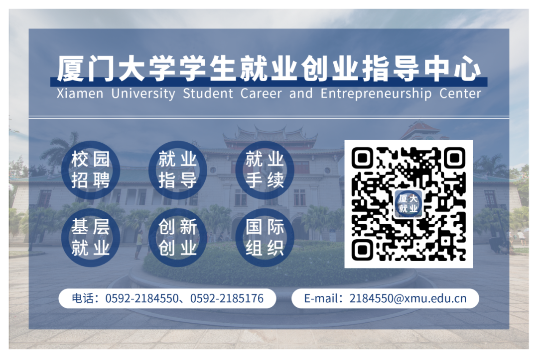 获取招聘实习资讯,欢迎加入官方就业信息群;获取基层就业资讯,欢迎关注“XMU基层就业”公众号;获取其他最新动态,欢迎浏览就业创业指导中心官网。