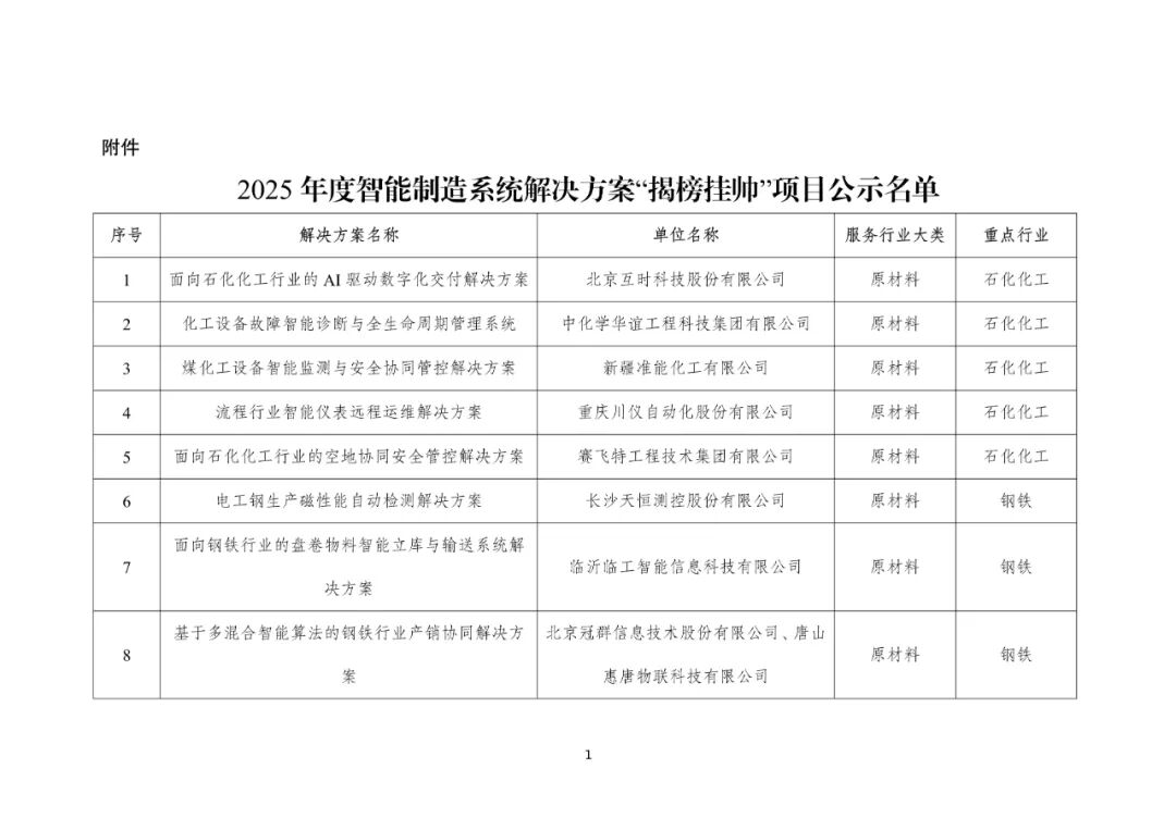 关于2025年度智能制造系统解决方案“揭榜挂帅”项目的公示根据《关于开展2025年度智能制造系统解决方案“揭榜挂帅”项目申报和已揭榜项目验收工作的通知》(工信厅联通装函〔2025〕411号),现将拟入选的2025年度智能制造系统解决方案“揭榜挂帅”项目名单进行公示,请社会各界监督。如有异议,请在公示期内将书面意见反馈至工业和信息化部装备工业一司(智能制造处)。公示时间:2025年12月10日-2025年12月16日附件:2025年度智能制造系统解决方案“揭榜挂帅”项目公示名单【版权申明】素材来源于政府官网,如果涉及版权及相关权益问题,请及时与我们联系,我们会第一时间积极配合处理,谢谢!