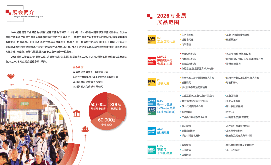 在全球工业数字化转型加速、国内 “双碳” 目标持续推进的背景下,成渝地区作为西部工业核心阵地,正迎来产业升级的关键窗口期。2026 成都国际工业博览会(CDIIF),依托中国工博会、汉诺威工博会两大知名工业展会的资源与运营经验,是西部颇具影响力的工业展会。