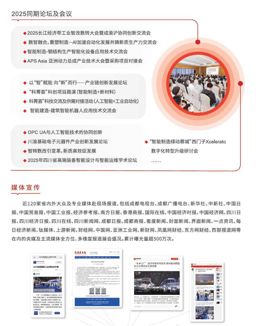 展会同期将举办 20 余场论坛、产业对接会与科创路演活动,覆盖行业热点与区域产业发展议题。包含长江经济带工业智改数转、AI 赋能自动化、建筑智能机器人、川渝电子元器件产业创新等主题,行业从业者、企业代表、技术人员可现场交流,分享技术经验、探讨行业方向、对接相关项目,搭建行业交流与合作的平台。