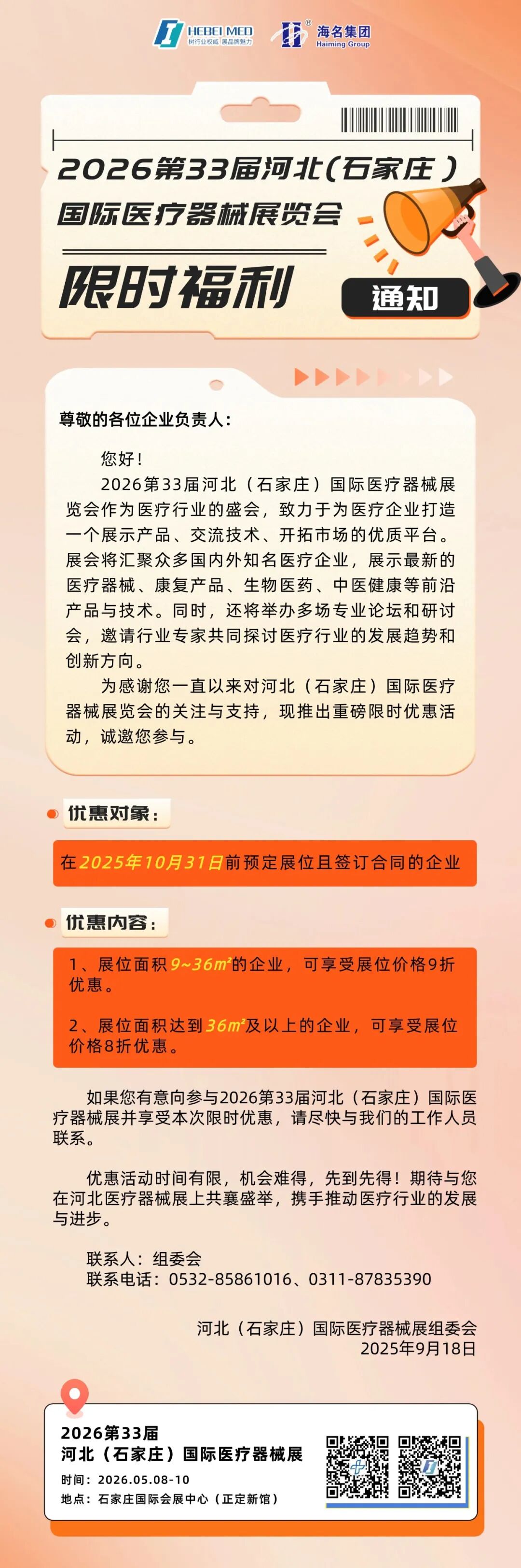 目前,第33届河北石家庄国际医疗器械展览会招展工作已全面开启,诚邀您即刻预定展位,抢占市场先机,拓展无限商机!2026 年 5 月 8 日至 10 日,让我们相聚石家庄,共襄行业盛会!