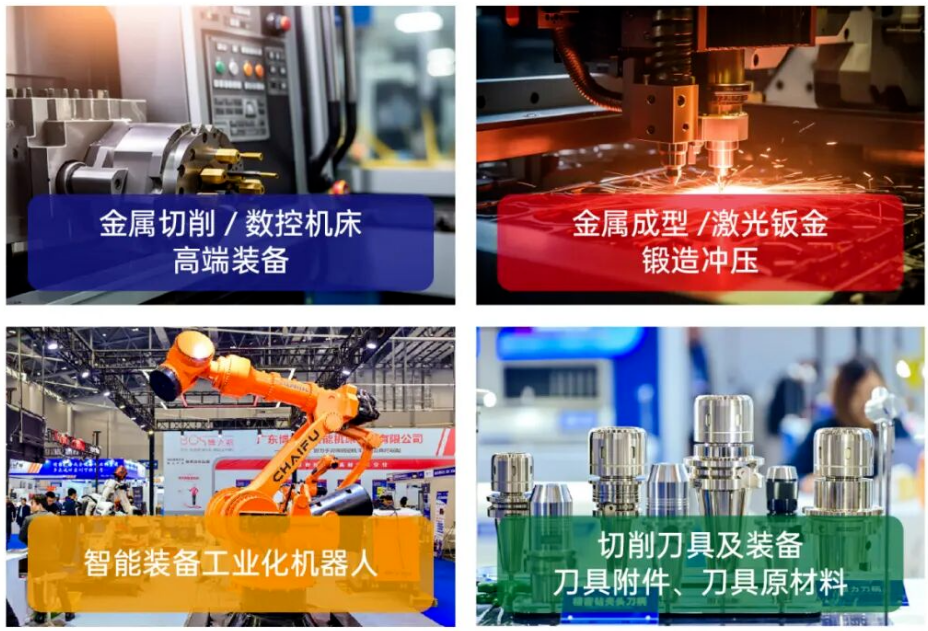 全面覆盖机加工全生态链:金属切削 / 数控机床 / 高端装备展区、金属成型 / 激光钣金 / 锻造冲压展区、智能装备 / 工业自动化机器人展区,以及切削刀具及装备、刀具附件、刀具原材料展区。