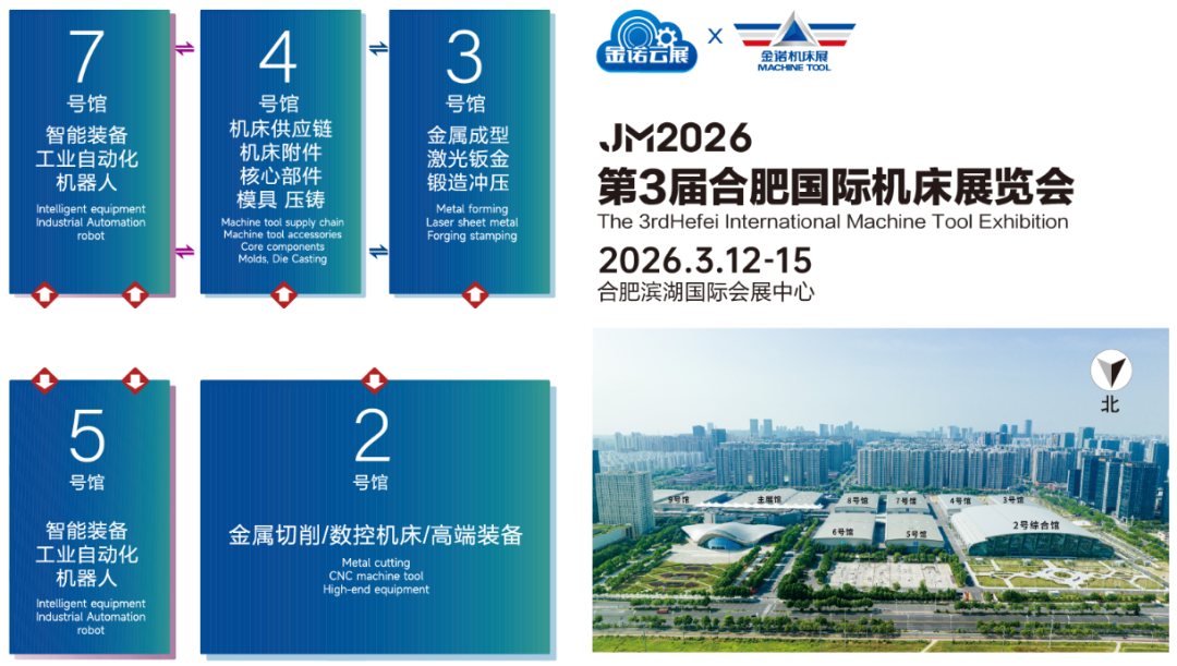 JM2026金诺·第3届合肥国际机床展将于3月12-15日在合肥滨湖国际会展中心举办!本届展览会集聚国际优质机床工具品牌展商,携带最新产品、金属切削/数控机床、激光钣金/金属成形、机床供应链/机床附件、模具加工及配件、智能制造/工业自动化/机器人等行业加工应用解决方案。