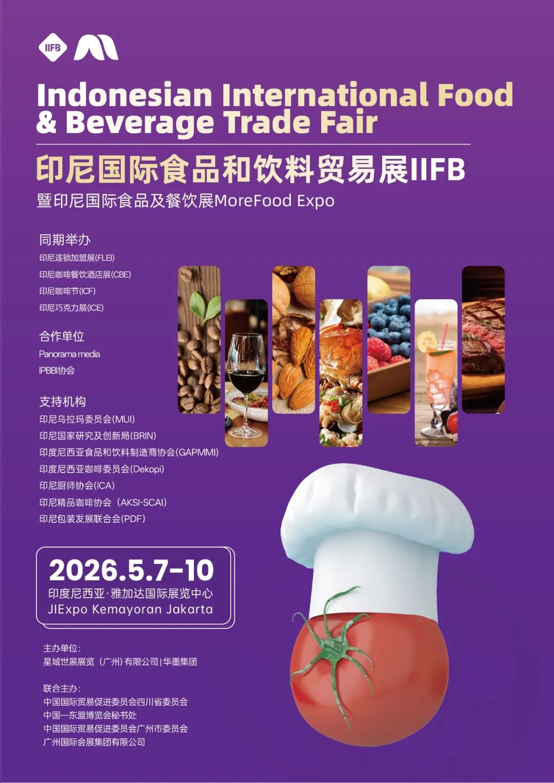 2026印尼国际食品和饮料贸易展IIFB暨印尼国际食品及餐饮展MoreFood Expo由星域世展、华墨展览集团主办,中国国际贸易促进委员会、四川省委员会、中国一东盟博览会秘书处、中国国际贸易促进委员会广州市委员会、广州国际会展集团有限公司联合主办,与印尼Panorama Media强强联手共同打造。旨在将全球优质食品和食材及相关产业链产品引入印尼市场。