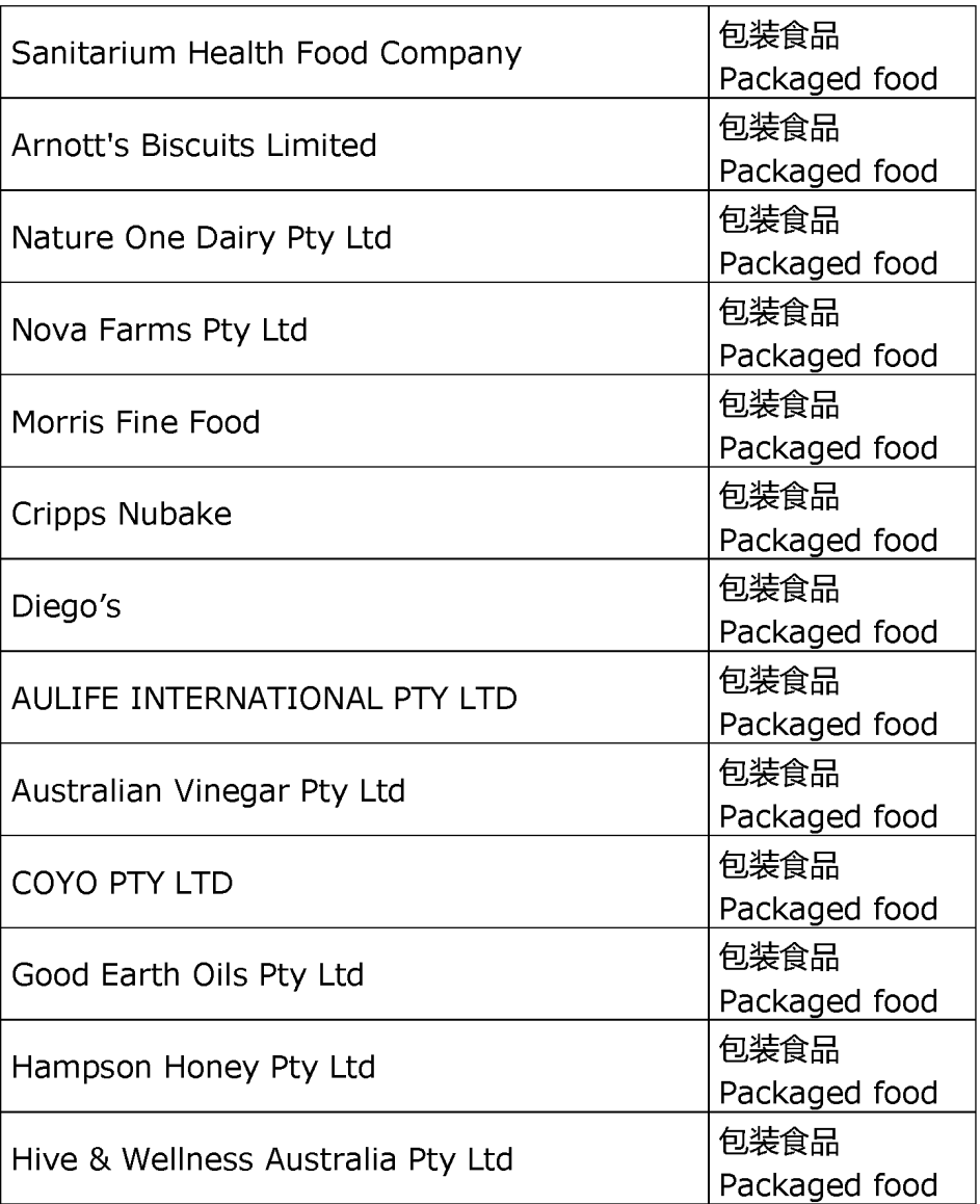 此外,澳大利亚是世界上重要的包装食品产地之一,在为国内及国际出口市场提供优质包装食品方面经验颇丰。独特的地理条件丰富多变,产品种类多样,与北半球相反的生产季节,使澳大利亚出口包装食品产业具备了品质上乘且不断创新的突出优势。今年澳大利亚共有 25 家包装食品企业参展,具体展商名单如下: