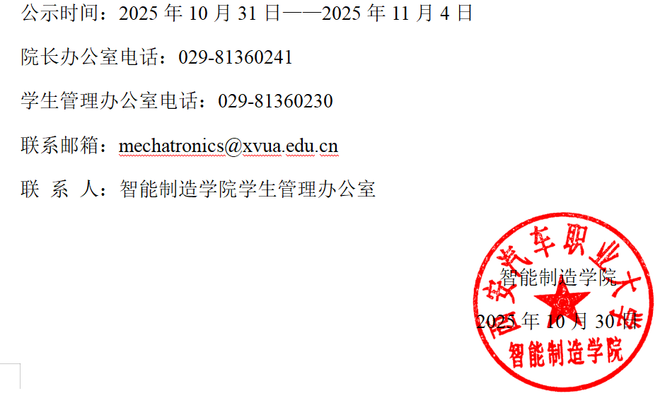 按照国家相关文件和学校资助办的通知要求,经学院评定,2024-2025学年智能制造学院国家励志奖学金评定学生名单如下。现予以公示,公示期内,如有异议者,请以书面、电话等形式实名反映给学院有关部门。