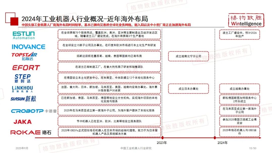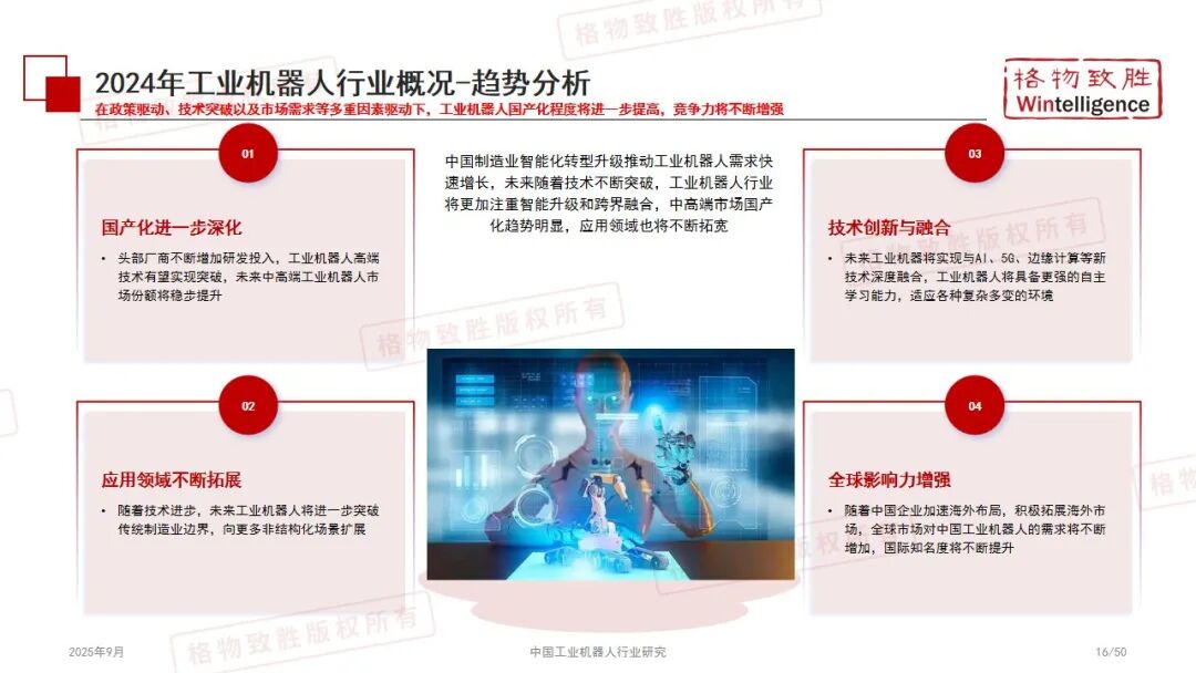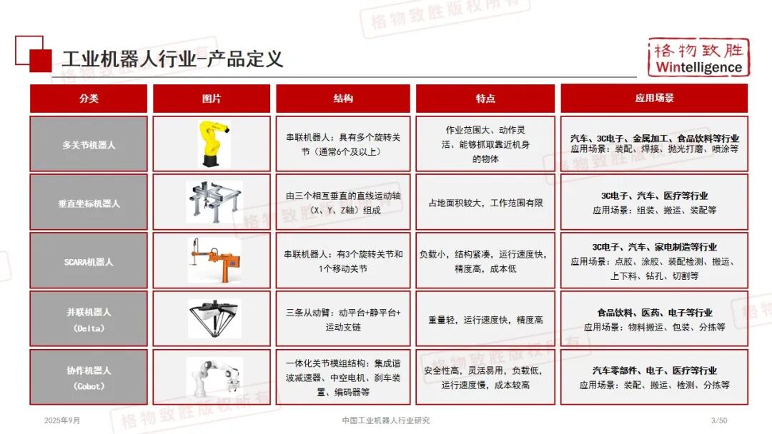 报告由格物致胜(Wintelligence)发布,系统分析中国工业机器人行业的政策生态、市场竞争、应用前景及典型厂商。行业受政策推动与下游需求驱动,2024 年销量 34 万台,虽增速放缓但长期增长可期;产品涵盖多关节、SCARA、协作机器人等类型,汽车、电子是主要应用行业;国产化趋势显著,本土品牌市场份额提升,头部企业加速海外布局,人形机器人成为新兴热点,为行业发展提供全面洞察。
