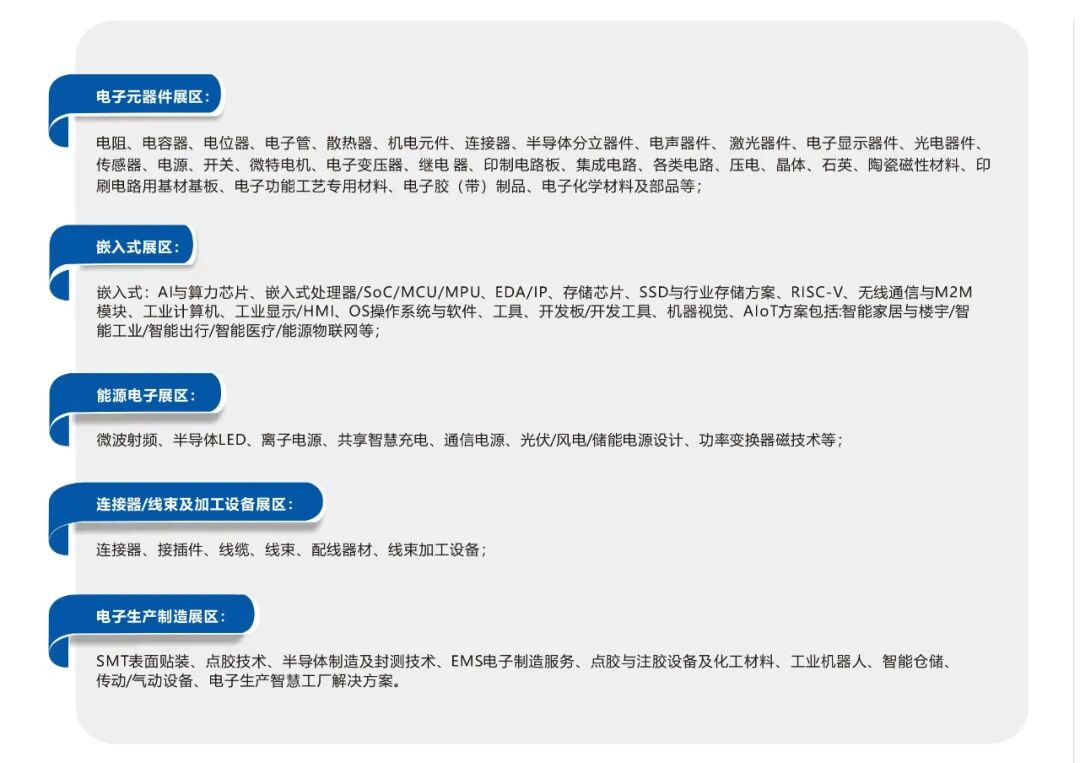 电子元器件、嵌入式技术、半导体/芯片、显示技术、PCBs/PWBs、线束与连接器、电子测试测量技术、电子智能制造、半电源及能源电子
