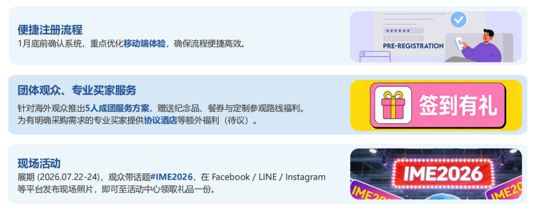 便捷观展,高效对接。展会将通过优化移动端预登记、推出团体观展福利、提供定制参观与配对服务、现场配套设施及社交打卡有礼等举措,全面提升专业观众观展体验与对接效率。