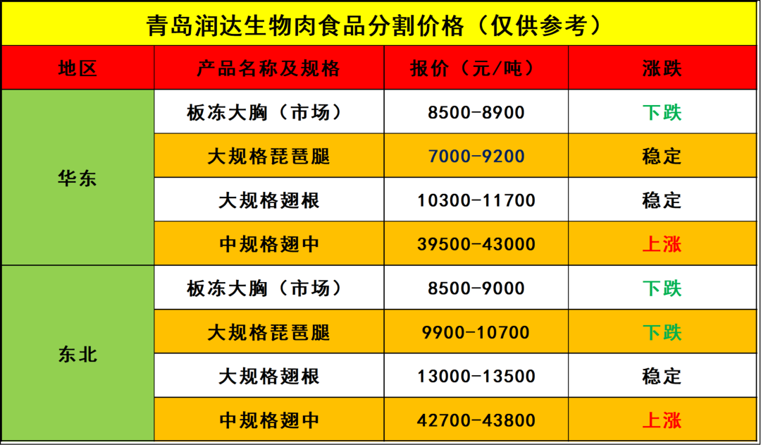 上游毛鸡价格稳定,经销商及食品加工企业补货心态谨慎,市场成交节奏不快,鸡胸肉产品价格继续下调。各工厂产品库存增加,终端产品消化不快,预计产品价格或偏弱运行。