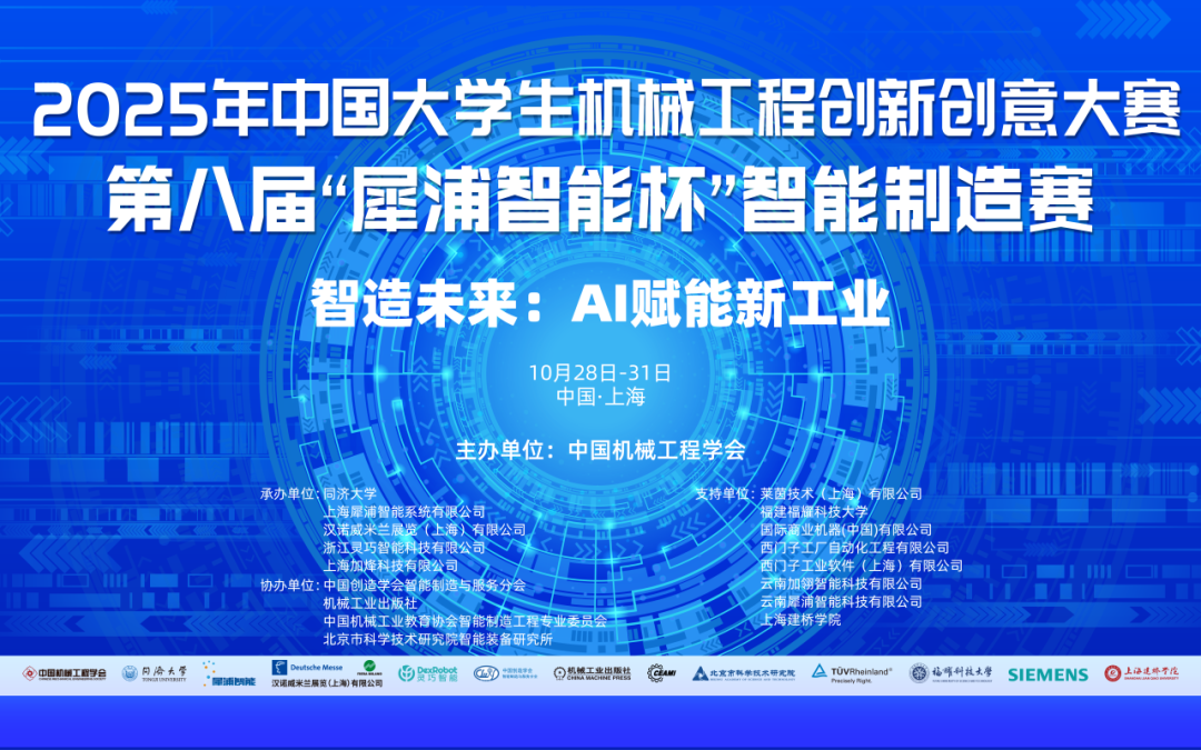 破界·洞悉未来制造——最新技术展示、青年才俊比武、院士专家开讲。10月31日上午,2025中国大学生机械工程创新创意大赛第八届“犀浦智能杯”智能制造赛决赛闭幕式在上海新国际博览中心落下帷幕。本次赛事由中国机械工程学会主办,同济大学、上海犀浦智能系统有限公司、汉诺威米兰展览(上海)有限公司、浙江灵巧智能科技有限公司、上海加烽科技有限公司联合承办,汇聚德国莱茵TÜV、IBM、西门子、机械工业出版社、上海建桥学院等,联合多家知名企业和高校支持,旨在促进我国智能制造领域的科技进步与人才培养,吸引了来自全国数百所高等院校的精英学子同台竞技展现青年一代的创造力与热情。