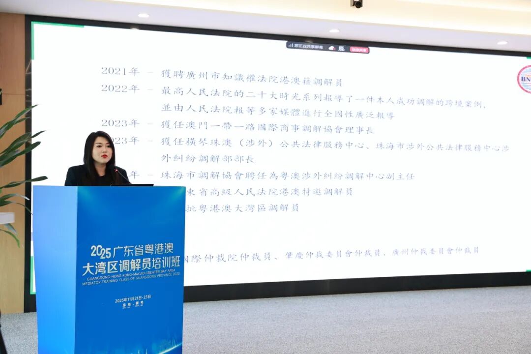 澳门一带一路国际商事调解协会理事长许冰结合澳门《民事诉讼法》《家事调解制度》等法律条文,深入讲解跨境调解的五大原则——自愿、保密、中立、高效、豁免。她通过民间借贷、物业服务、婚姻家庭等典型案例,剖析粤澳两地法律差异与调解策略,强调“法院+港澳调解员”联合调解模式在大湾区纠纷解决中的实践价值。