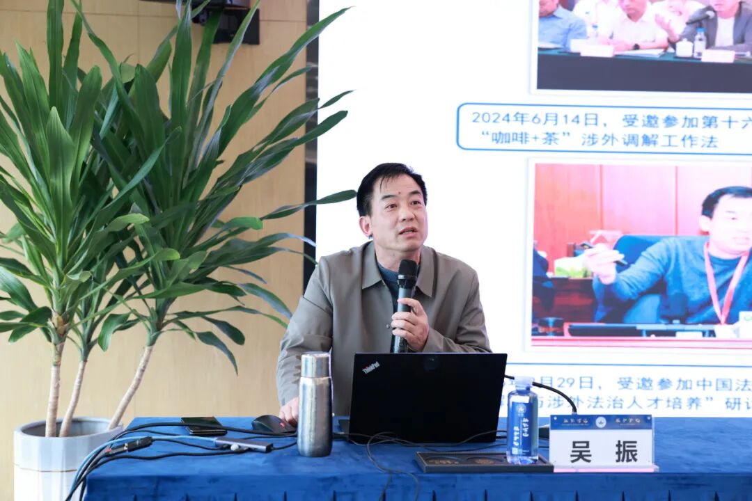 涉外中心执行理事兼主任吴振围绕习近平法治思想与粤港澳大湾区调解机制展开,解读中央对大湾区建设的战略要求,介绍大湾区调解工作的机制、制度及发展规划。并与学员共同探索调解国际化路径,同时分享“咖啡+茶”涉外调解工作法的创新实践。