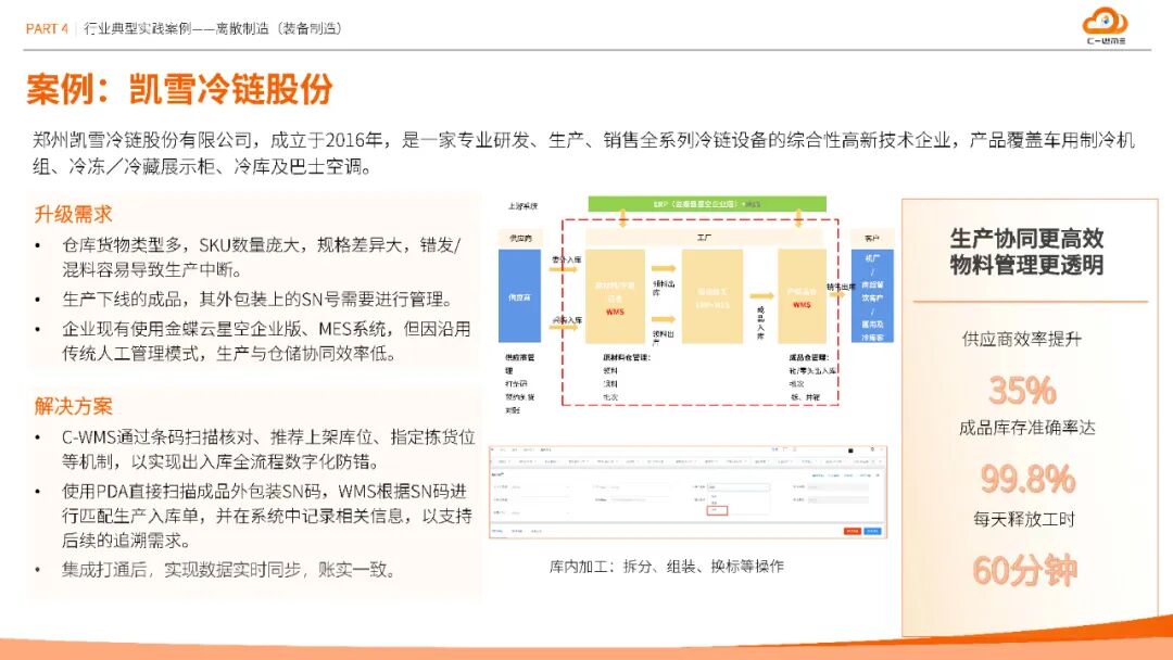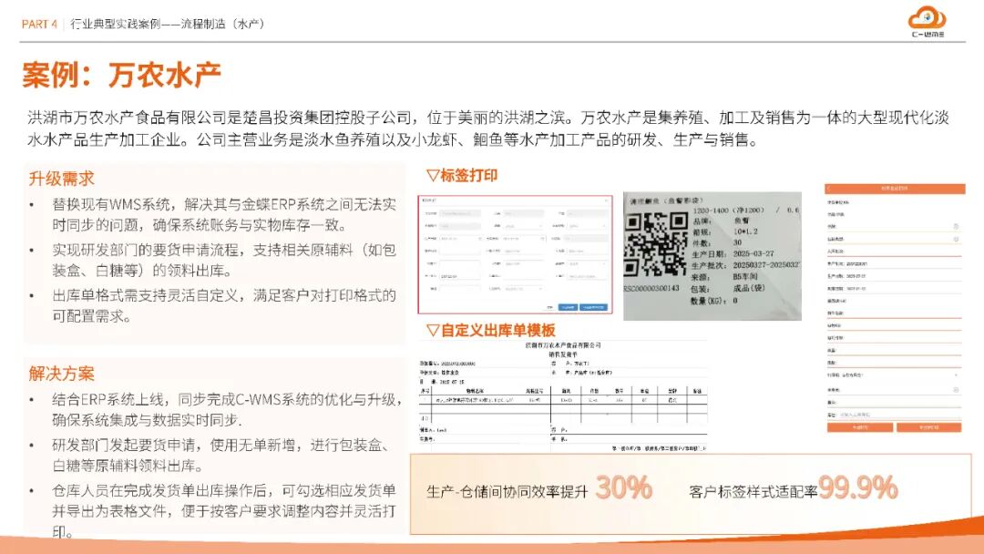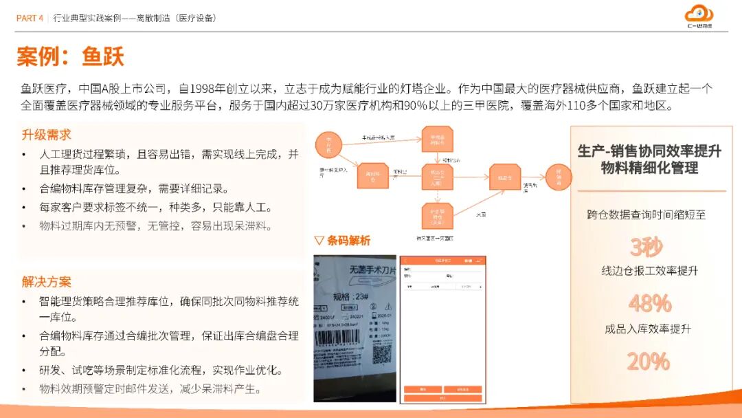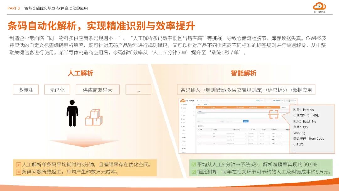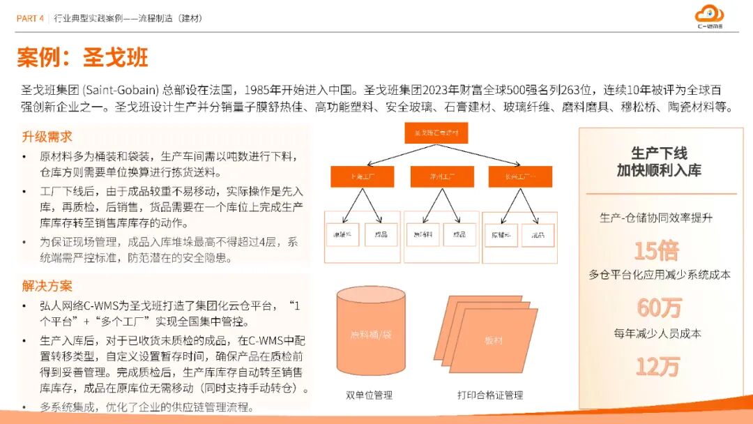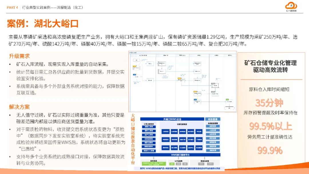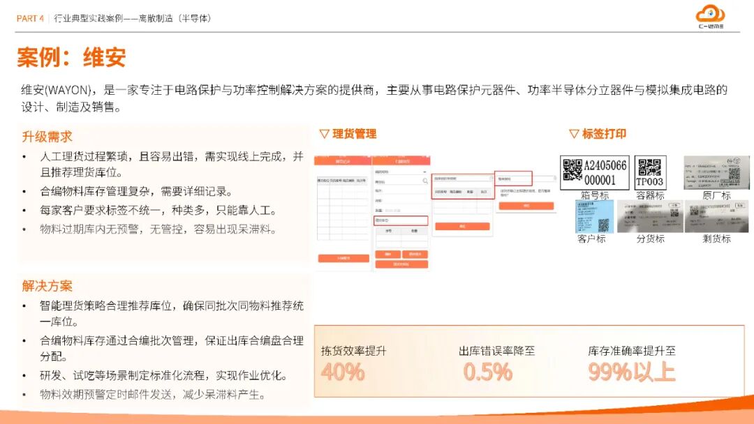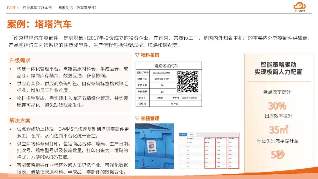 方案在汽车、半导体、医疗等十大行业验证成效:南京塔塔汽车通过容器管理与条码标准化,盘点效率提升30%;维安半导体智能理货策略使拣货效率提升40%,库存准确率99.9%;圣戈班建材集团化云仓平台每年减少人员成本12万元;湖北大峪口化工无人值守过磅缩短原料入库时间25%,劳务计量准确性达99.9%。这些数据印证了方案的普适性与经济性。