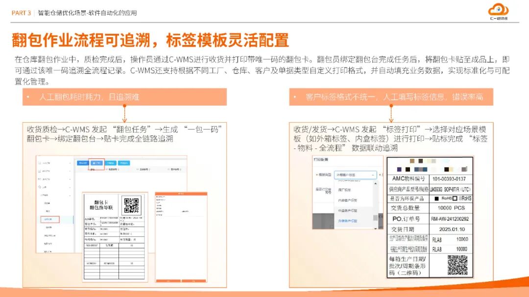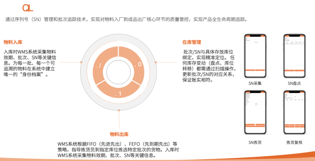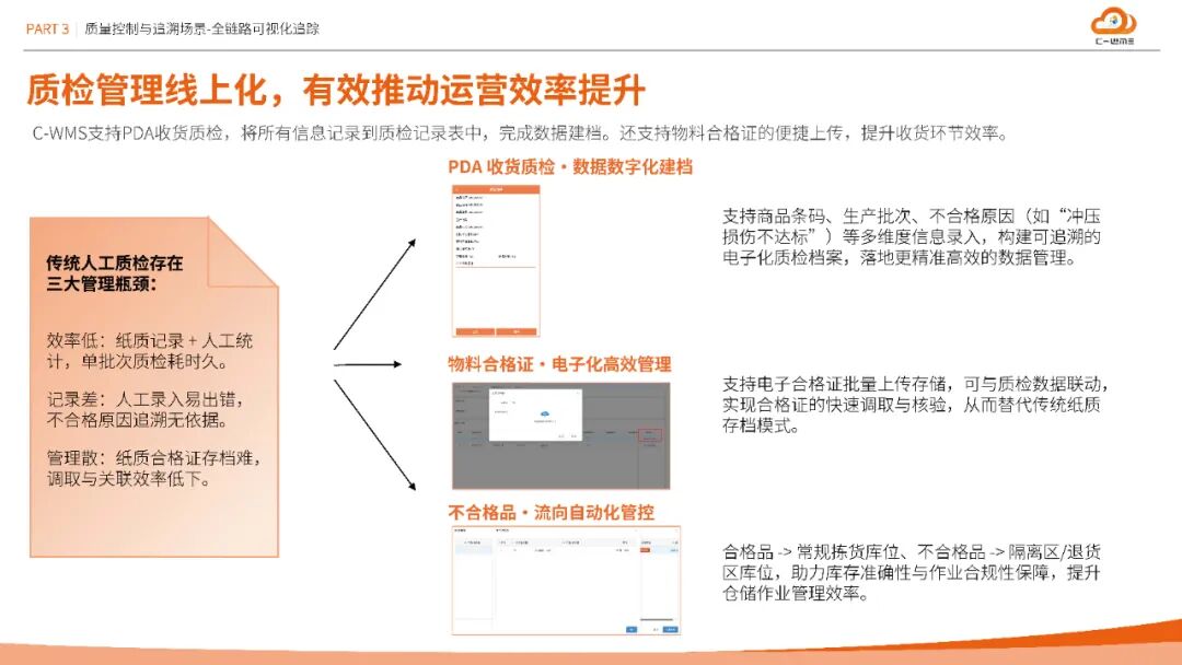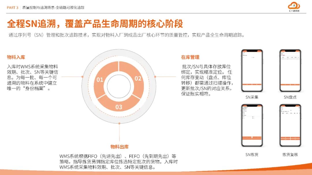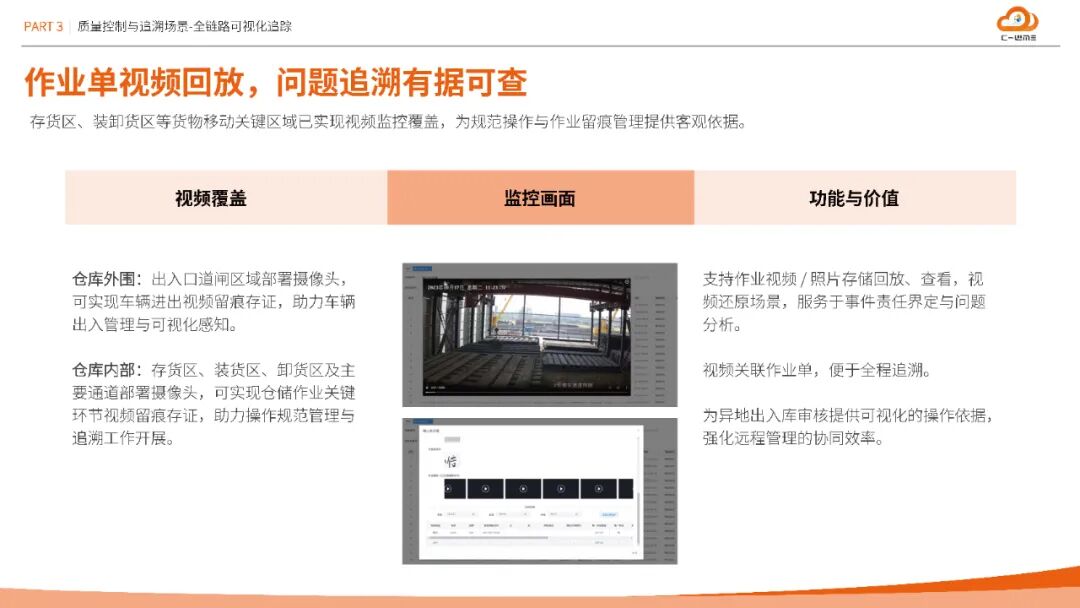 方案构建从物料入库SN采集、在库管理到出库复核的全程序列号追溯体系,结合PDA质检数据化建档与电子合格证管理,实现质量信息100%线上化。更创新性引入作业单视频回放功能,通过关键节点摄像头覆盖与单据关联,为异地审核与责任界定提供可视化依据,将追溯效率提升60%以上。