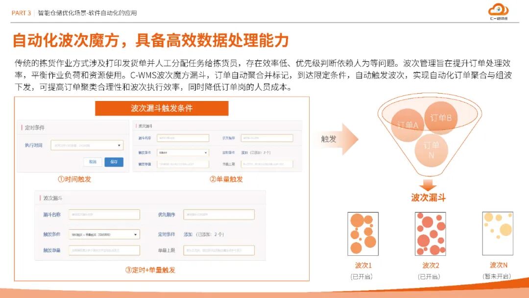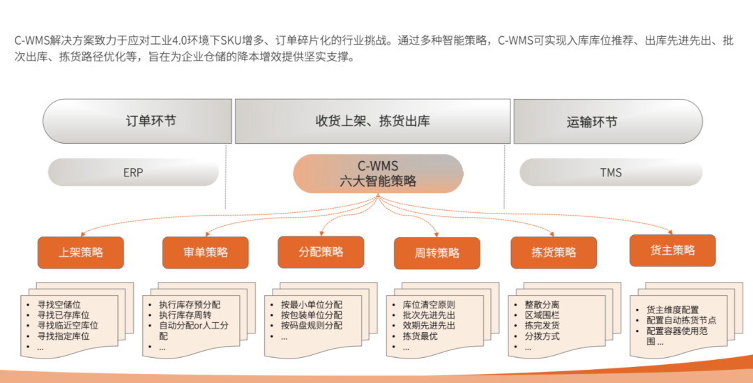 方案突破传统仓储依赖人工记忆的瓶颈,构建六大智能策略引擎(上架、审单、分配、周转、拣货、货主),实现从"人找货"到"策略驱动作业"的范式转变。通过波次魔方漏斗模型,系统可基于时间、单量或复合条件自动触发订单聚合,将拣货效率提升35%,订单岗人力成本降低30%。
