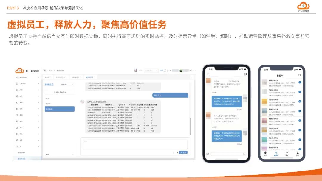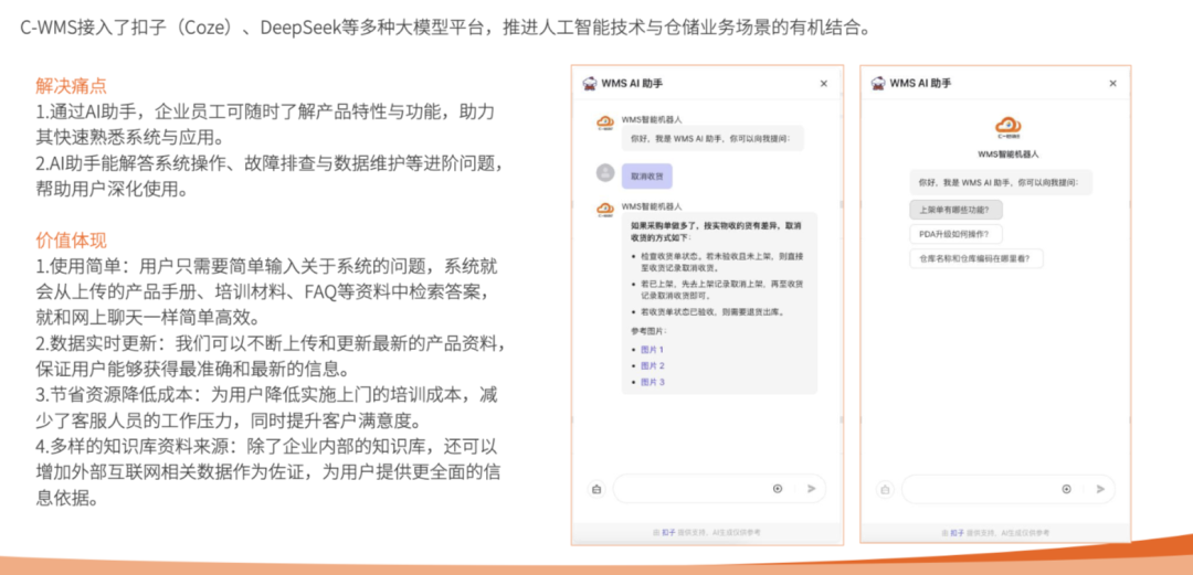 方案率先接入扣子(Coze)、DeepSeek等大模型平台,打造WMS AI助手与虚拟员工。AI助手基于自然语言交互,可实时解答系统操作、故障排查等问题,降低培训成本50%;虚拟员工则通过规则引擎执行实时监控与异常预警(如滞销、超时),推动运营管理从事后补救转向事前干预,实现决策智能化跃迁。