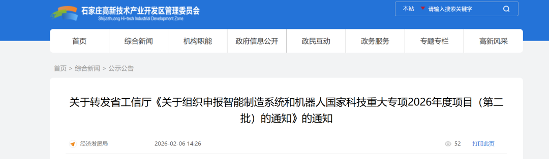 石家庄高新区经济发展局发布关于转发省工信厅《关于组织申报智能制造系统和机器人国家科技重大专项2026年度项目(第二批)的通知》的通知。