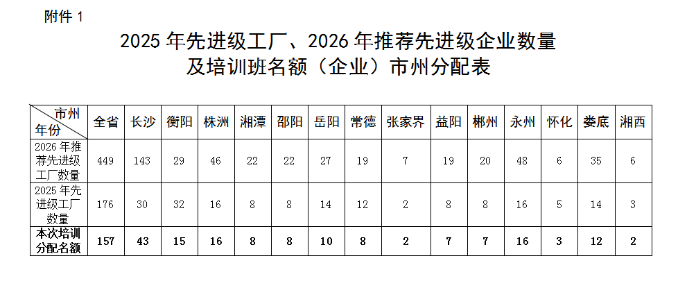 1.2025年先进级工厂、2026年推荐先进级企业数量及培训班名额(企业)市州分配表