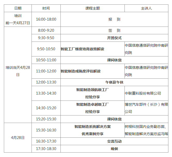 为做好湖南省2026年度智能工厂梯度培育工作,强化智能制造政策宣贯,推动卓越级、领航级智能工厂建设,提升全省智能制造工作推进能力,助力打造国家重要先进制造业高地,经研究,我厅委托湖南省工业和信息化行业事务中心于4月28日在长沙市举办2026年智能制造专题培训班,现将有关事项通知如下: