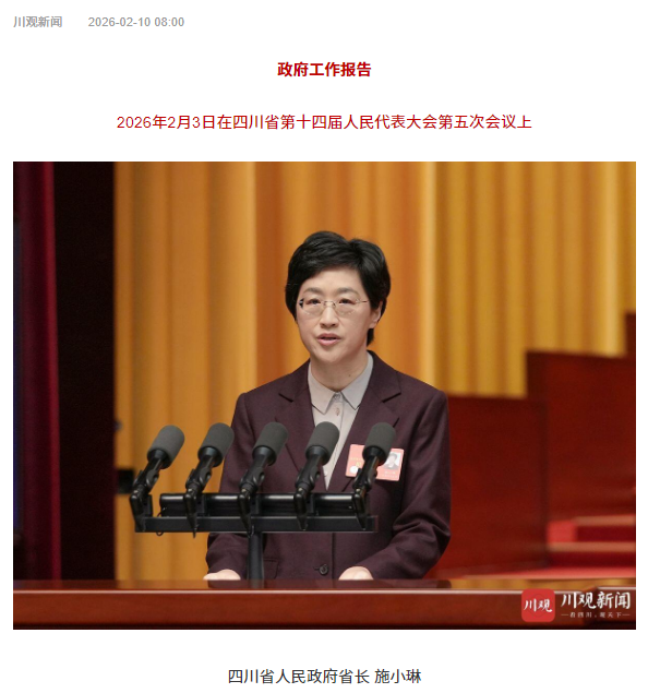 2月3日,四川省第十四届人民代表大会第五次会议在成都开幕,省长施小琳代表省政府作2026年政府工作报告。报告不仅回顾了2025年四川经济社会发展的扎实成效,也梳理了“十四五”时期的关键突破,展望了2026年暨“十五五”开端之年的宏伟蓝图,字里行间满是巴蜀大地的奋进动能。
