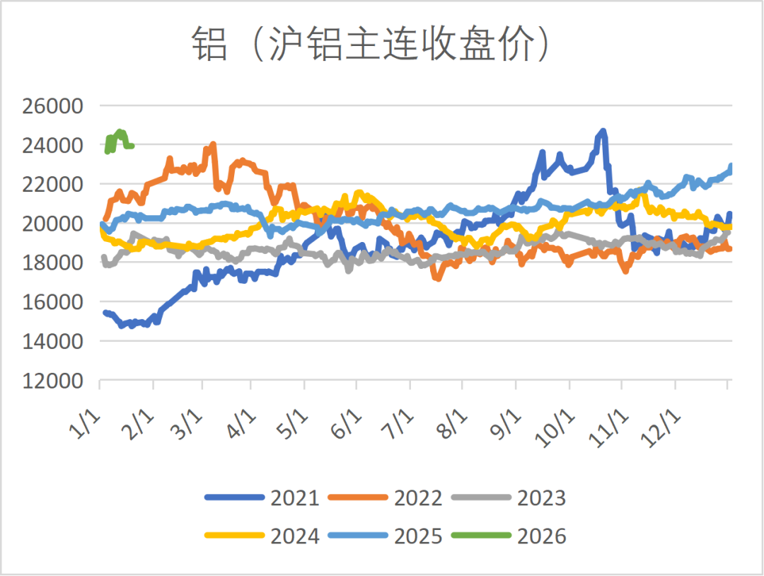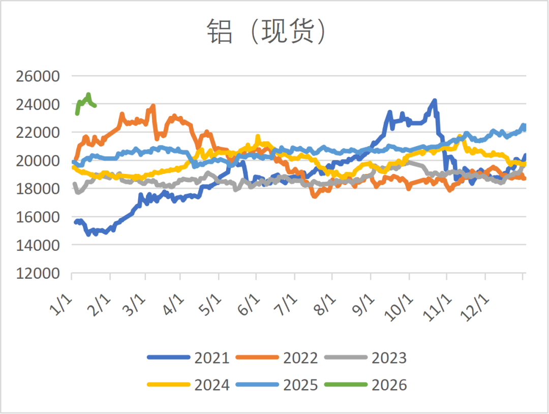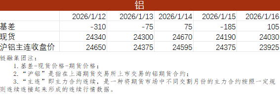 本周周内铝价震荡下行,截至1月16日沪铝主连收盘价23925元/吨,上海有色网现货价格24030元/吨,基差105元/吨。