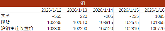 本周周内沪铜主连收盘价震荡下行,沪铜主连收盘价100770元/吨,上海有色网现货价格101855元/吨,基差1085元/吨。
