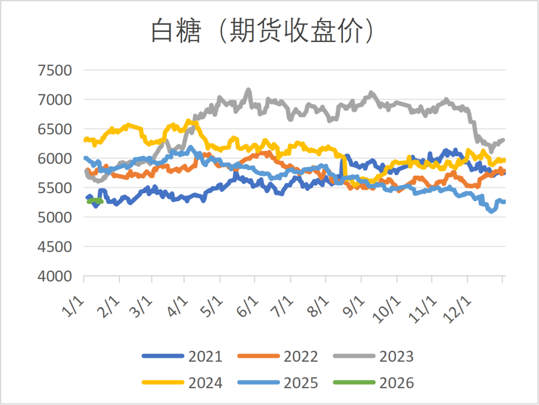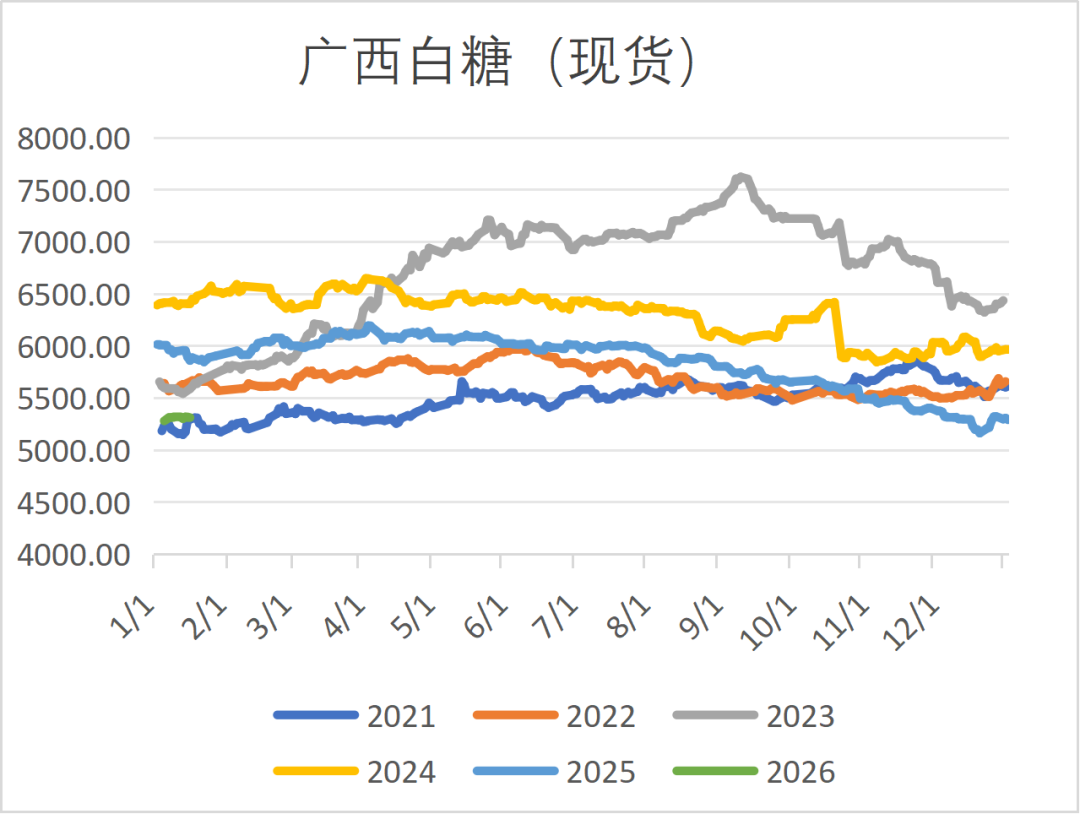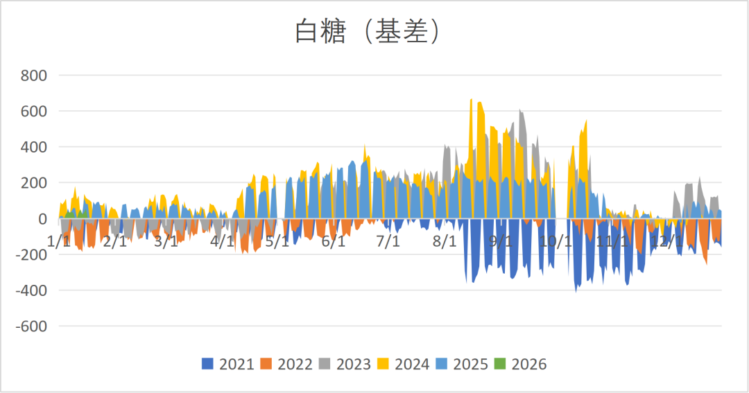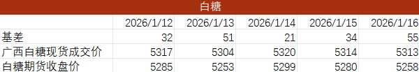 本周周内白糖价格震荡下行,白糖期货收盘价5258元/吨,广西白糖现货成交价5313/吨,基差55元/吨。