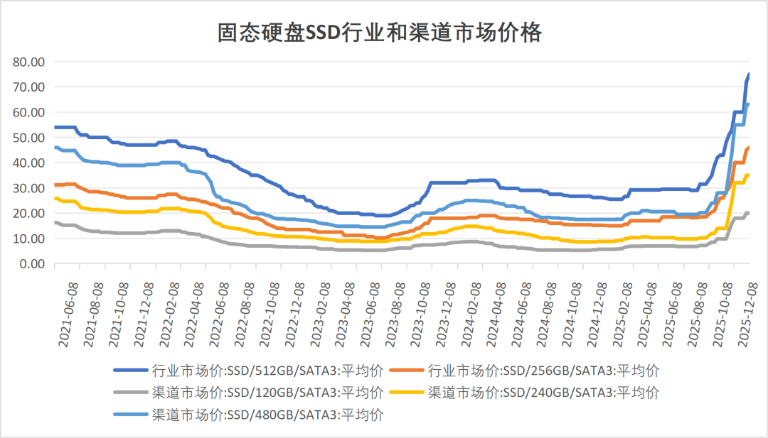 2026年1月13日固态硬盘SSD行业和渠道市场价格较两个月前有所波动:行业市场价:SSD/512GB/SATA 3的均价为75美元,较两个月前上升74.42%;行业市场价:SSD/256GB/SATA 3的均价为46美元,较两个月上升76.92%;渠道市场价:SSD/120GB/SATA 3的均价为20美元,较两个月前上升104.08%;渠道市场价:SSD/240GB/SATA 3的均价为35美元,较两个月前上升150.00%;渠道市场价:SSD/480GB/SATA 3的均价为63美元,较两个月前上升125.00%。