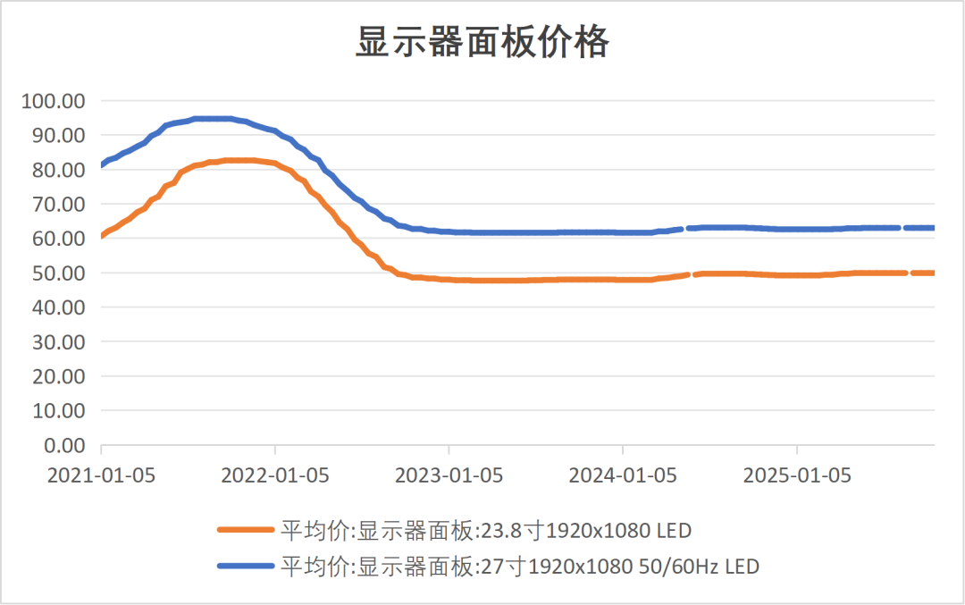 2026年1月5日显示器面板价格与前两周价格持平,27寸63.00美元/片,23.8寸49.9美元/片。