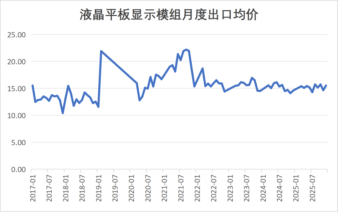 2025年12月液晶平板显示模组月度出口均价为15.53万美元/万个,较2025年10月环比上升0.06%。