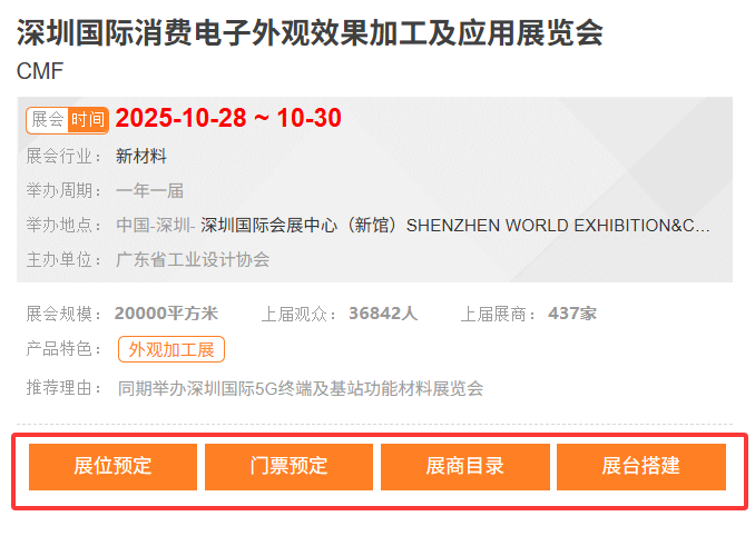 深圳国际消费电子外观效果加工及应用展览会(CMF)由广东省工业设计协会、深圳市真空技术行业协会联合主办。携手全球知名品牌终端、设计机构、材料企业、加工制造、设备厂商倾力打造国际新材料新工艺及色彩展为CMF行业提供产业对接、创新展示与互动交流的专业平台。