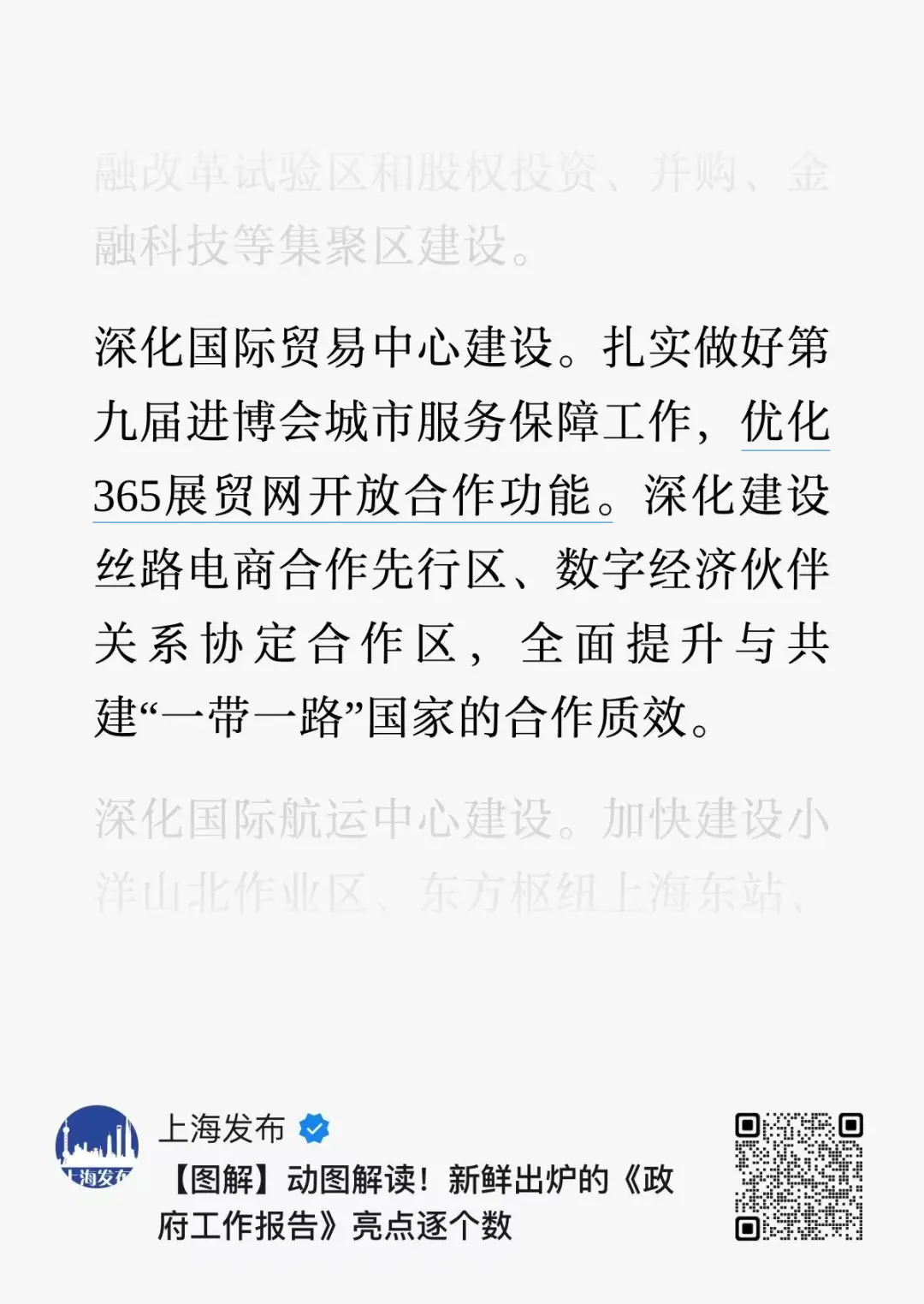 在“上海发布”权威解读的《政府工作报告》亮点中,“365展贸网”被重点提及并正式列入2026年上海深化国际贸易中心建设的重点任务。报告明确提出:“优化365展贸网开放合作功能”。