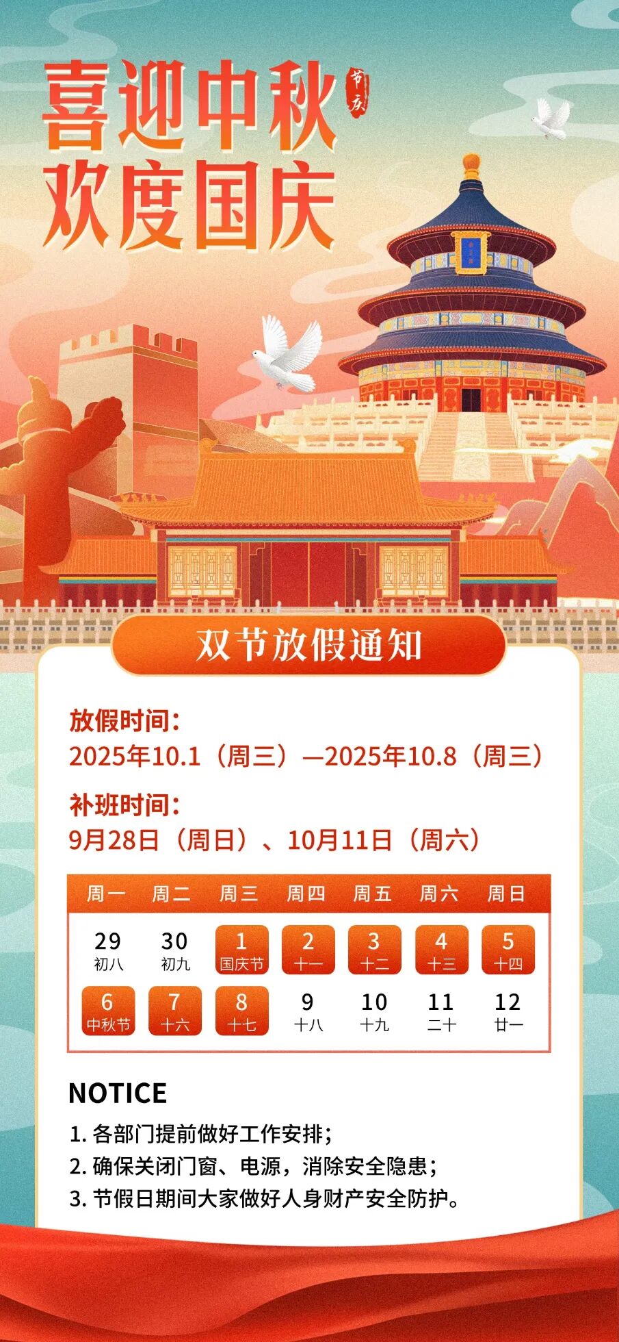值此中华人民共和国成立76周年华诞暨中秋佳节来临之际,根据《国务院办公厅关于2025年部分节假日安排的通知》精神,结合大湾区资产管理中心的实际运营需求,现将放假安排及相关事项通知如下,旨在弘扬爱国情怀、感恩奋进力量,共同肩负起中华民族伟大复兴的历史使命。