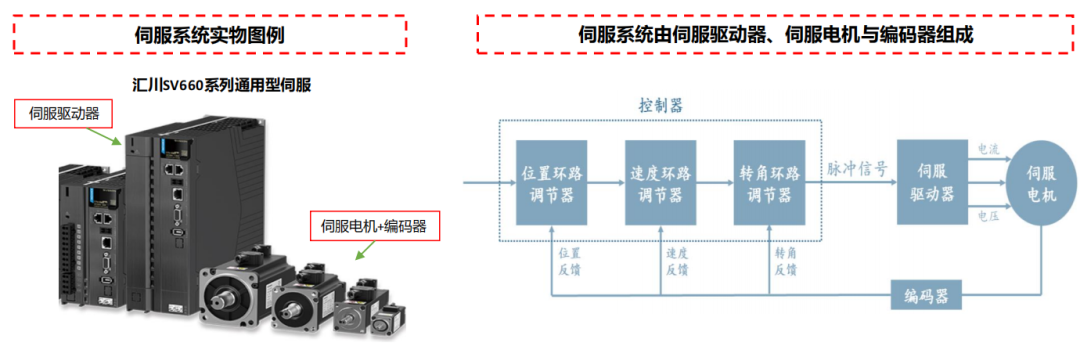 伺服系统可以实现精确、 快速、 稳定的位置控制、 速度控制和转矩控制。伺服系统是以物体的位移、 角度 、速度为控制量组成的能够动态跟踪目标位置变化的电机系统 ,可实现精确 、快速、稳定的位置控制、 速度控制和转矩控制 ,主要应用于对定位精度和运转速度要求较高的自动化控制领域。 伺服系统主要由伺服电机、 驱动器、 编码器组成 。其中 ,伺服电机是伺服系统的执行元件 ,伺服驱动器是伺服电机的一种控制器 ,一般通过位置、 速度和力矩三种方式对伺服电机进行控制 ,以实现高精度的传动系统定位; 编码器将信号或数据进行编制 ,转换为可用于通讯、传输和存储的信号形式。