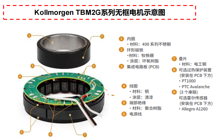无框力矩电机 ,全称为永磁无刷无框力矩电机 ,是一种特殊的伺服电机。和传统伺服电机相比 ,无框力矩电机没有轴、轴承、外壳或端盖。根据Kollmorgen官网 ,无框电机只有转子和定子两个部件 ,其中转子通常是内部部件 ,定子是外部部件。