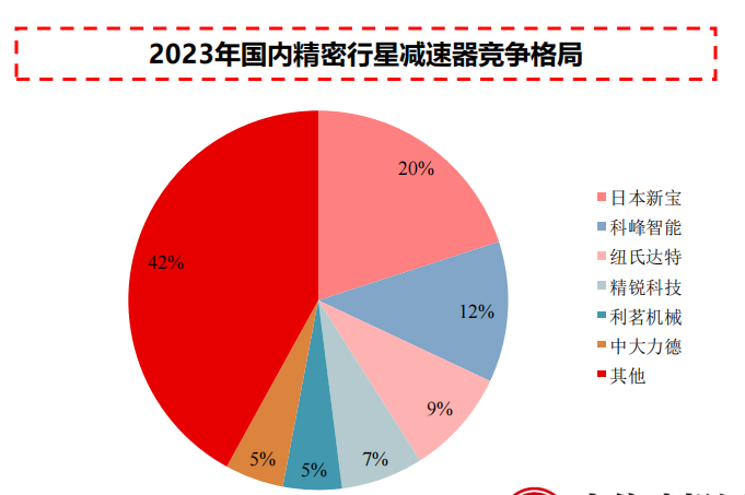 精密行星减速器市场格局高度集中,外资品牌占据高端细分领域。 2023年国内精密行星减速器市场中,日本新宝凭借技术优势,占据航空、军工及高端机器人等附加值最高的细分市场,市场份额领先;国产品牌科峰智能与纽氏达特通过构建全系列产品线与深耕非标定制,在工业自动化领域形成差异化竞争。